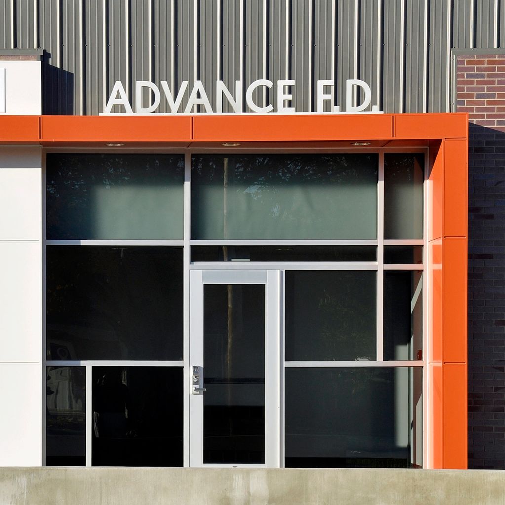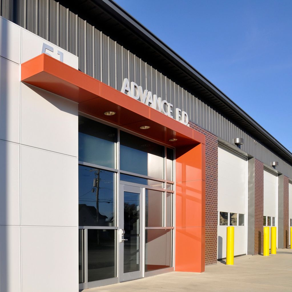 This new ground-up fire station features six emergency service vehicle spaces in three tandem bays of 2 spaces each, a large full-service kitchen, offices, sleeping quarters, recreation room, restrooms, and equipment rooms.